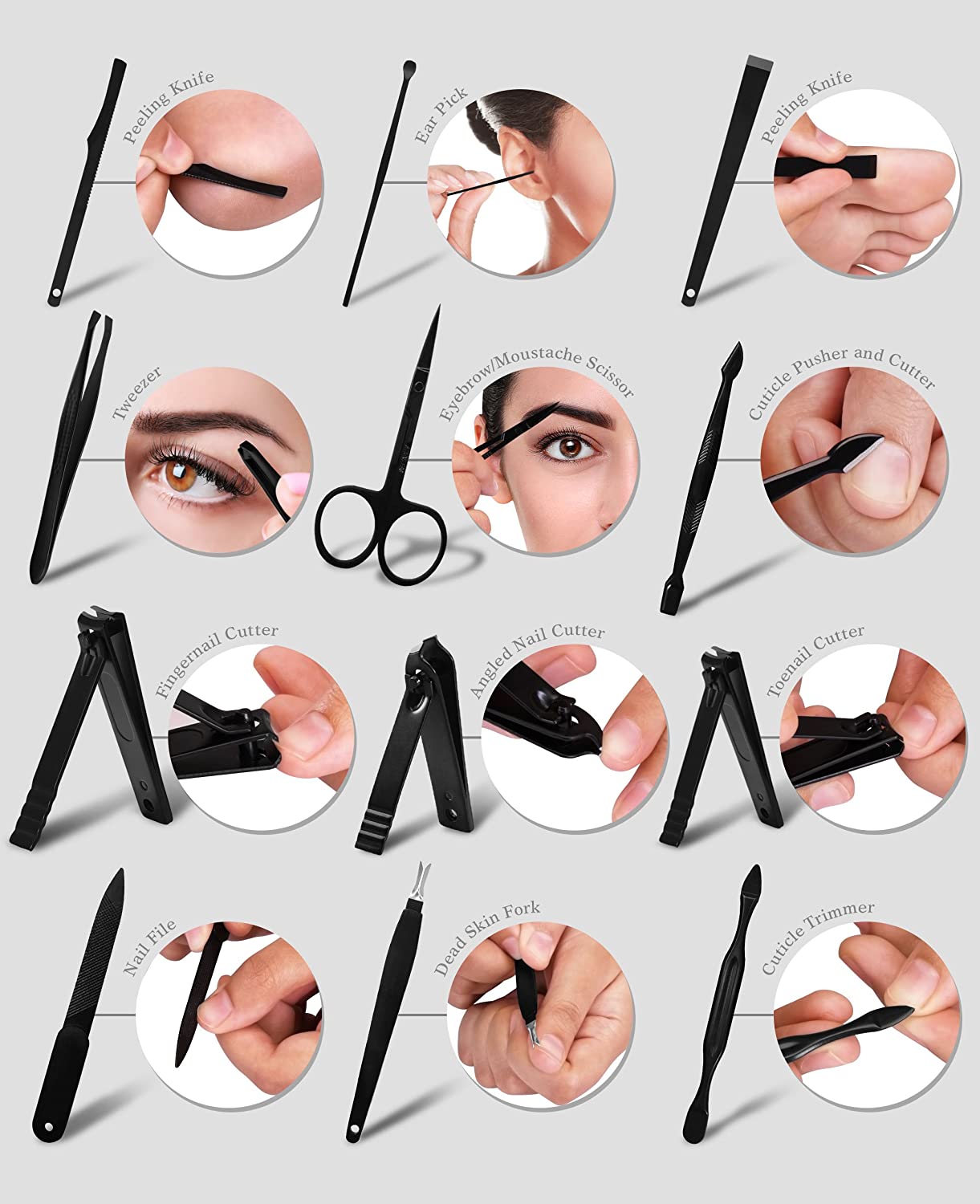 Our 16-piece grooming kit is designed to take care of all your manicure, pedicure, and facial care needs. Packed with elegance in travel-friendly case, this kit includes: